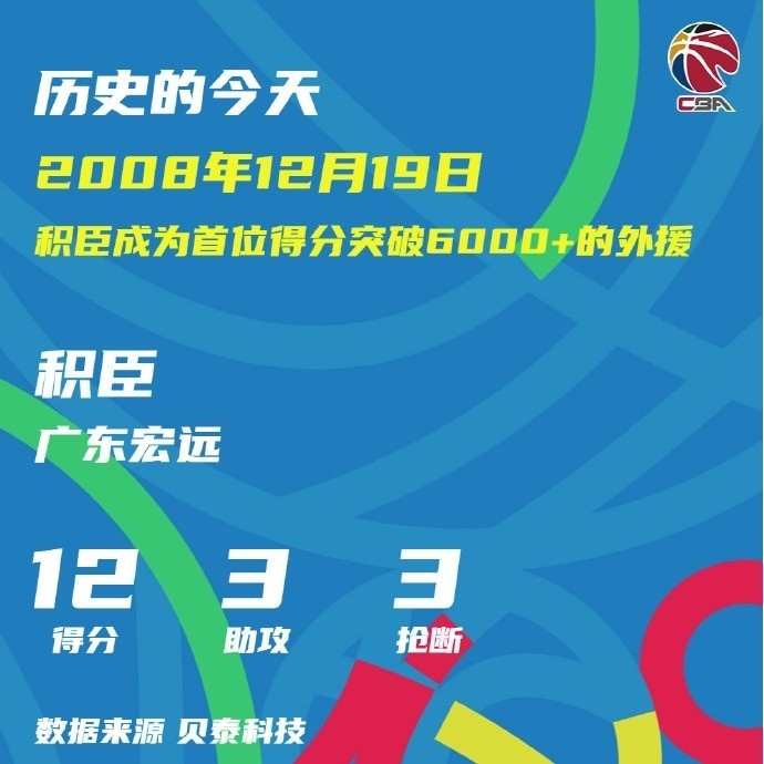 2008年12月19日,廣東宏遠(yuǎn)111-101浙江廣廈建設(shè),廣東外援積臣拿到12分,個(gè)人CBA聯(lián)賽總得分上升到6001分。積臣不僅是廣東宏遠(yuǎn)籃球俱樂(lè)部隊(duì)史唯一總得分超6000的外籍球員,同時(shí)也是CBA聯(lián)賽首個(gè)突破6000分大關(guān)的外籍球員。