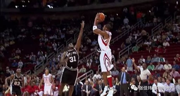 馬刺換防,201公分的羅斯——嗯,大前鋒馬利克·羅斯,不是德里克·羅斯——對(duì)位此前25投8中、三分球8投1中的麥蒂,前后步站位,離麥蒂一步距離;麥蒂起跳投籃,羅斯的手抬起已經(jīng)晚了。嗖。