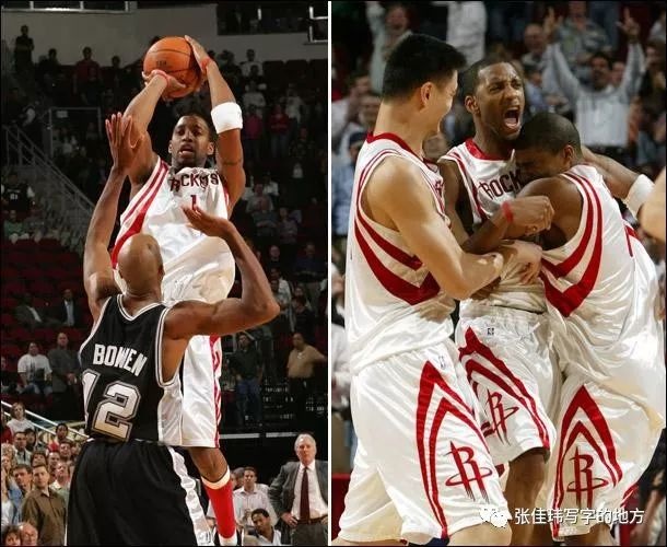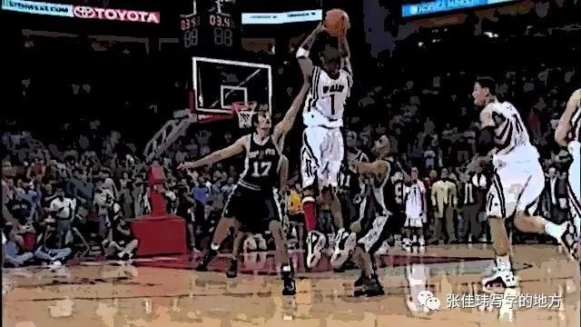 但麥蒂一個(gè)假動(dòng)作,恰恰閃出了一線空檔,蹭著鄧肯出手。NBA史上最卓越的防守者之一、七個(gè)月后就要拿到自己第三個(gè)總決賽MVP的鄧肯,被麥蒂打了四分。