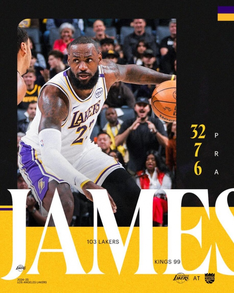 賽后,湖人官推曬出贏球海報,封面人物給到了詹姆斯。