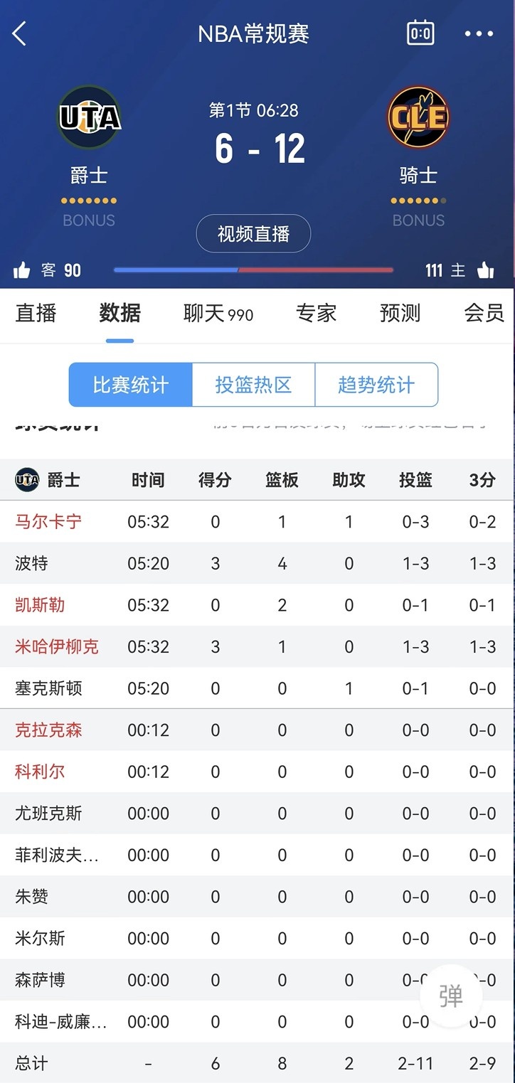 第一節(jié)雙方效率都不高。首節(jié)快過半,雙方得分為12-6。