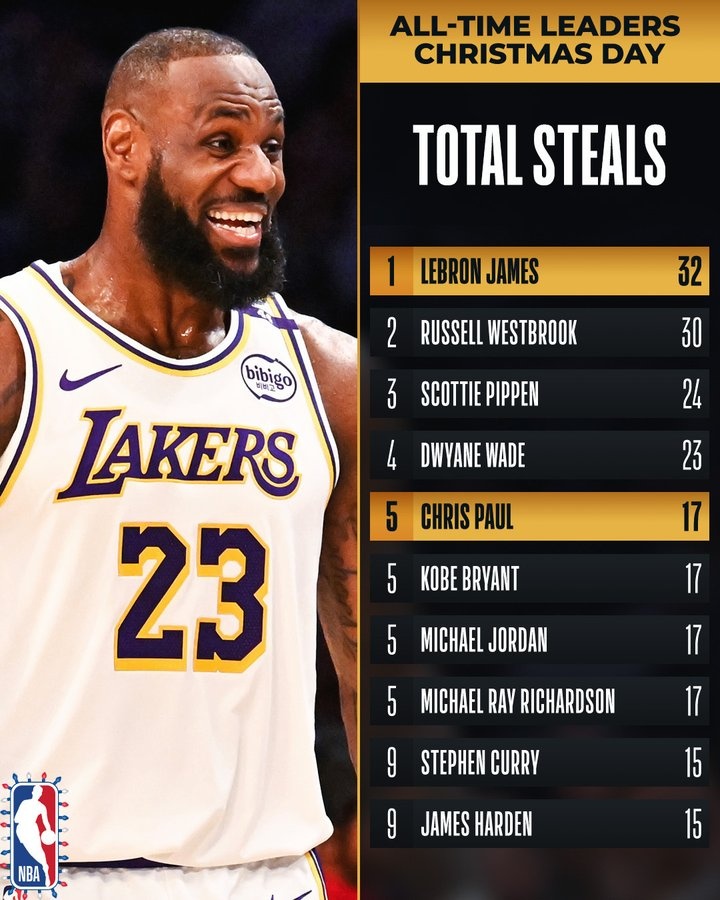 今天過后,在圣誕大戰(zhàn)搶斷榜中,詹姆斯32次力壓威少升至第一;保羅17次與科比、喬丹和邁克爾-雷-理查德森并列第五。