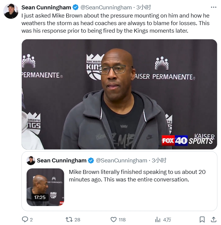 在今日訓練之后,邁克-布朗接受了20分鐘的媒體采訪,過后沒多久,國王就解雇了邁克-布朗。