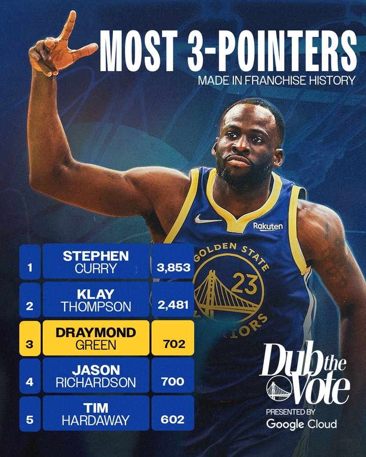就此,追夢的生涯命中了702個(gè)三分,排名勇士隊(duì)史第三,前二是他一起拿下四冠的水花兄弟,他距離第二的克萊“僅差”1779個(gè)三分。