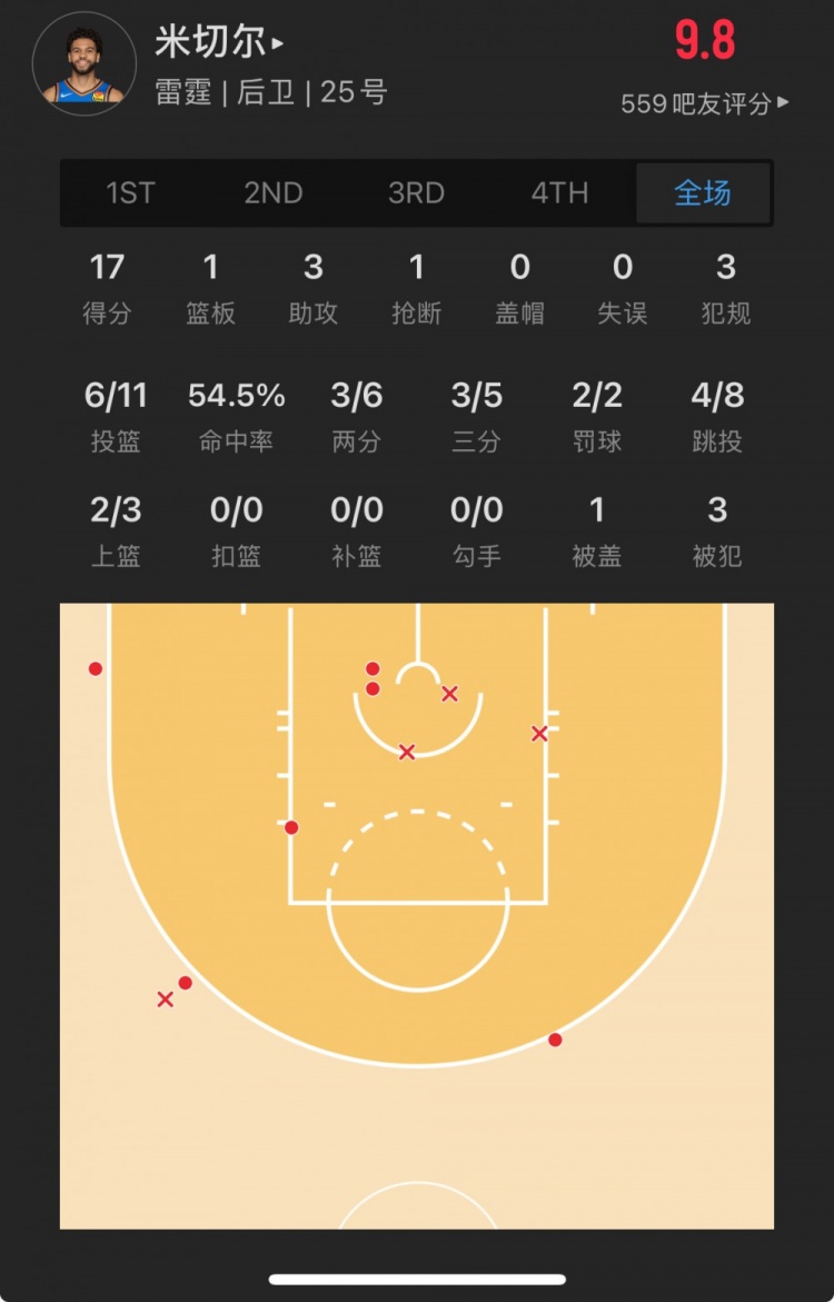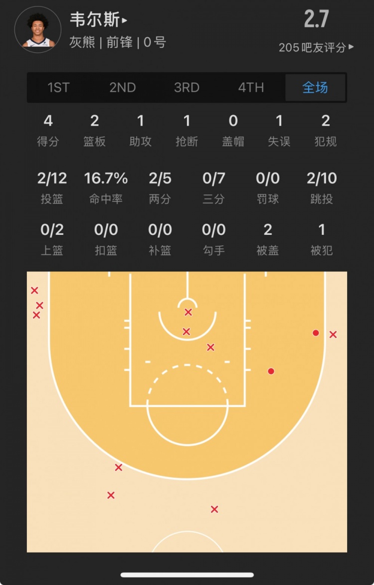 灰熊39號(hào)秀 杰倫-韋爾斯 登場(chǎng)25.2分鐘