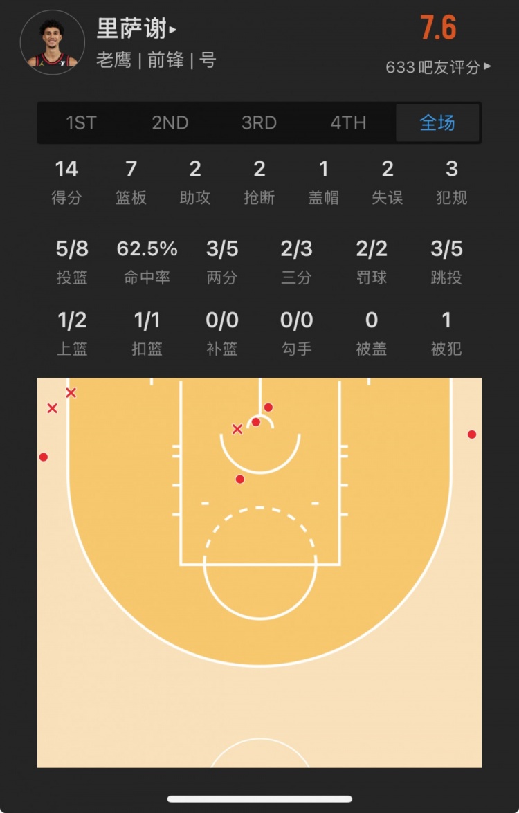 老鷹狀元秀 扎卡里-里薩謝 登場(chǎng)26.7分鐘