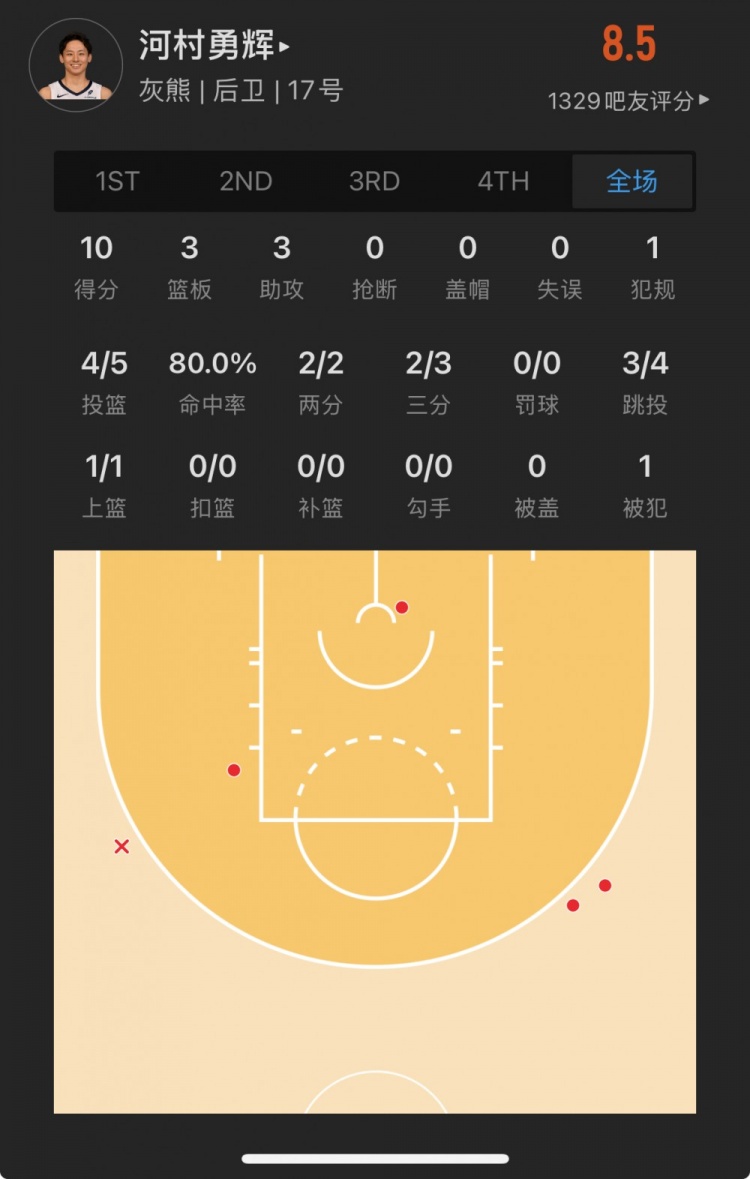 灰熊落選秀 河村勇輝 登場(chǎng)11.0分鐘