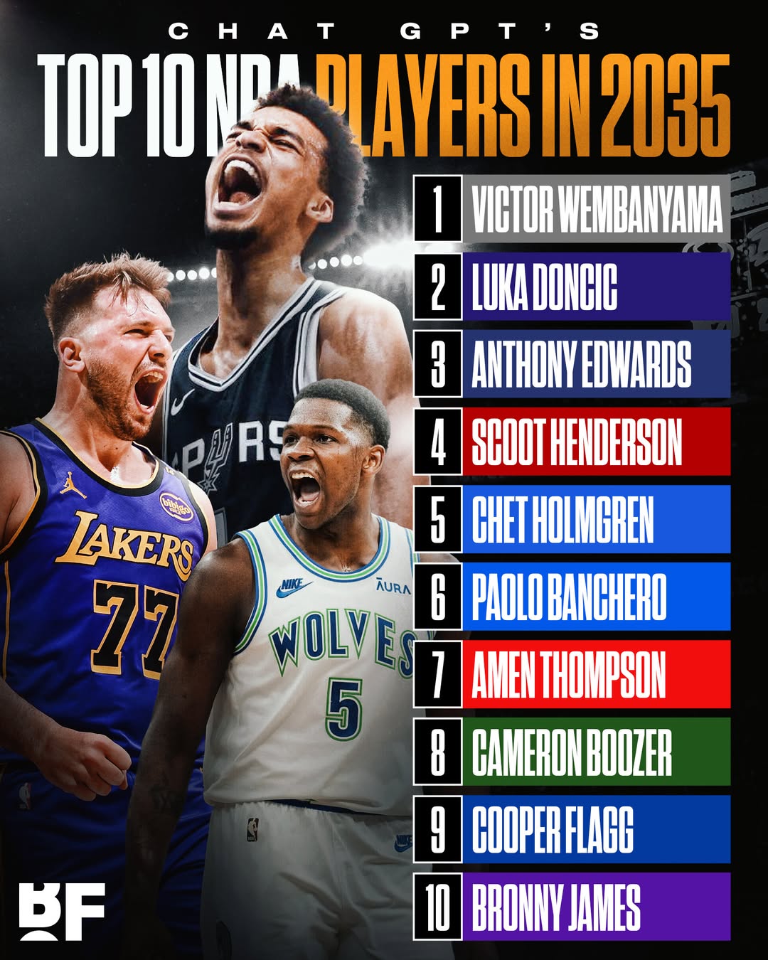 發(fā)布時(shí)間:2025年03月13日 00:09點(diǎn)擊:欄目:籃球新聞 1、文班2、東契奇3、愛德華茲4、亨德森5、切特6、班凱羅7、阿門8、卡梅隆-布澤爾9、弗拉格10、布朗尼 除特別注明外,本站所有內(nèi)容均為24直播網(wǎng)整理排版,轉(zhuǎn)載請(qǐng)注明出處:ChatGpt預(yù)測十年后前十球員:文班第一 東契奇第二 布朗尼第10 本文標(biāo)簽: 籃球 nba 湖人 東契奇 布朗尼 馬刺 森林狼 文班亞馬 愛德華茲 雷霆 開拓者
