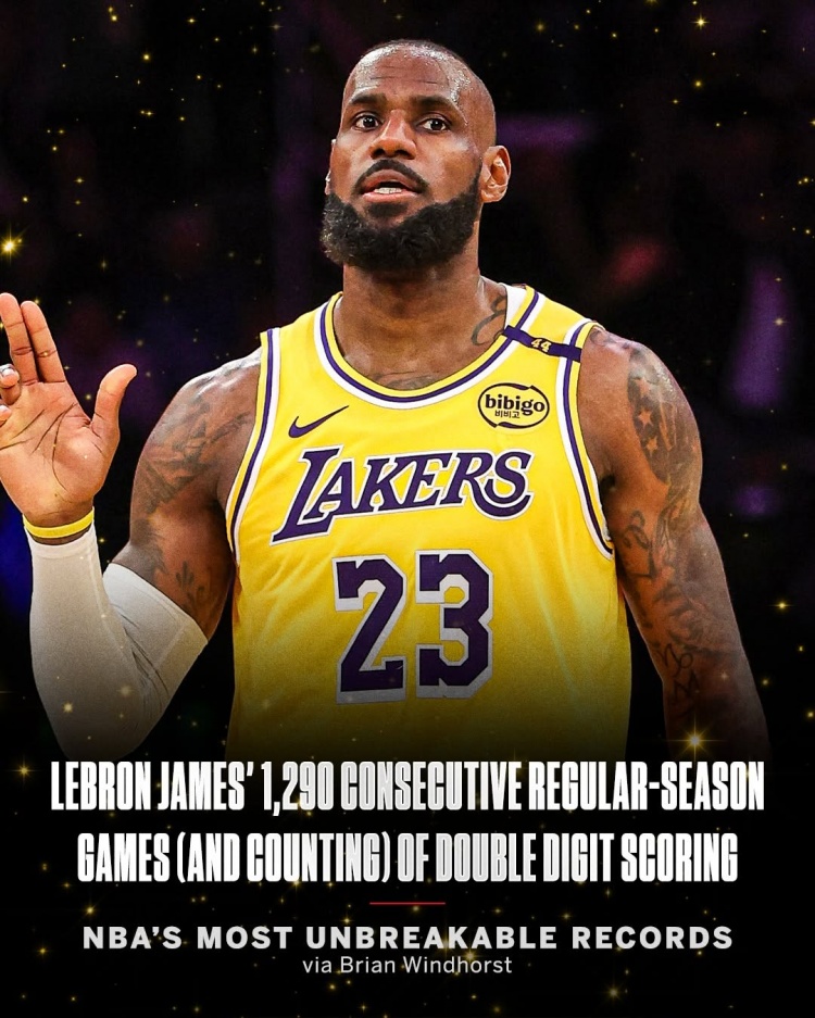 詹姆斯連續(xù)1290場常規(guī)賽得分上雙(仍在延續(xù))