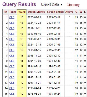 今日賽前騎士隊史連勝情況: