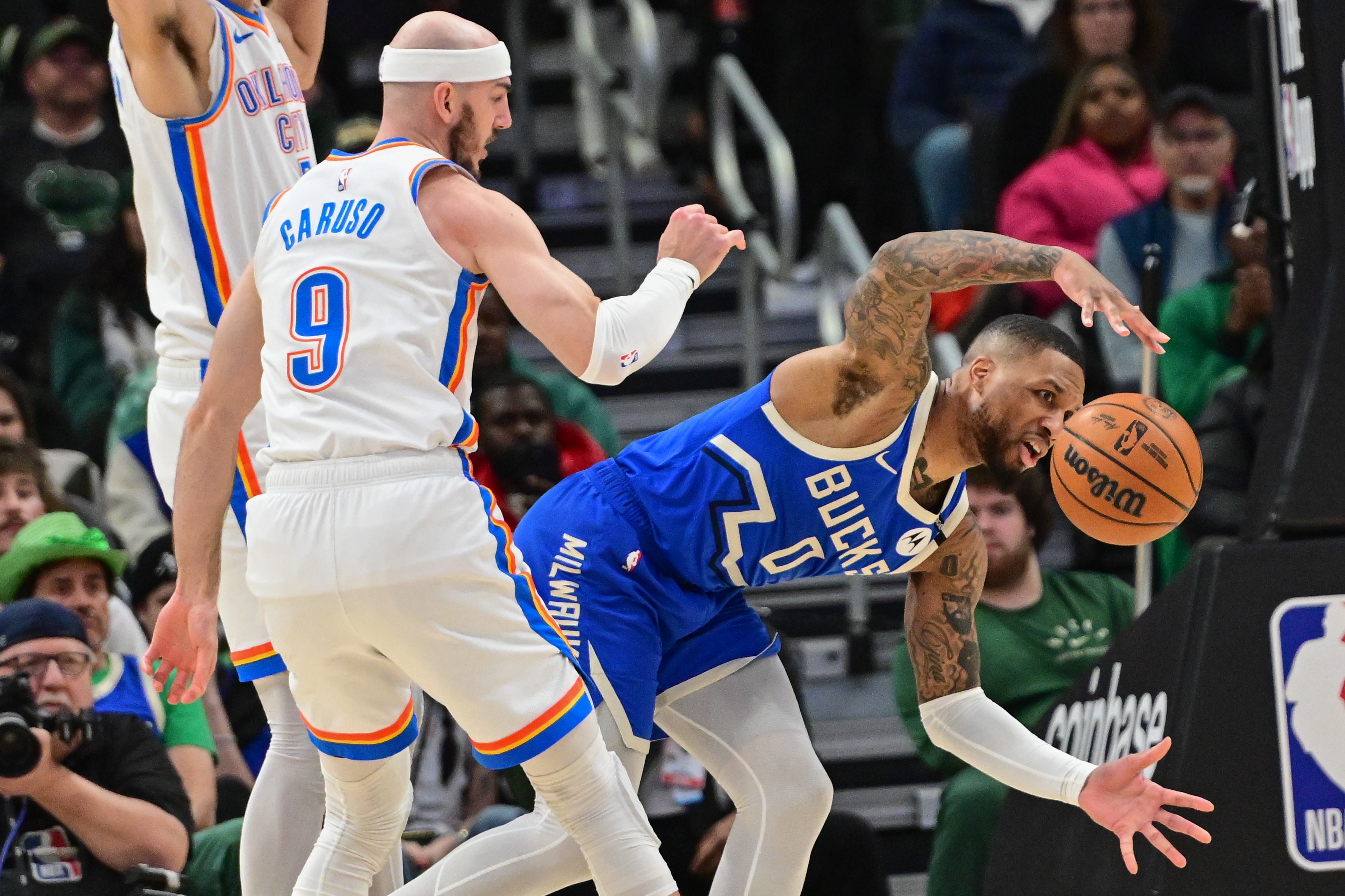 本場(chǎng)比賽,卡魯索攻防兩端表現(xiàn)出色,特別是在防守端他承擔(dān)了防守對(duì)方外線(xiàn)箭頭利拉德的重任。