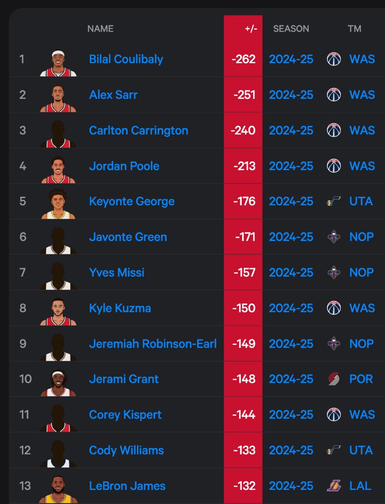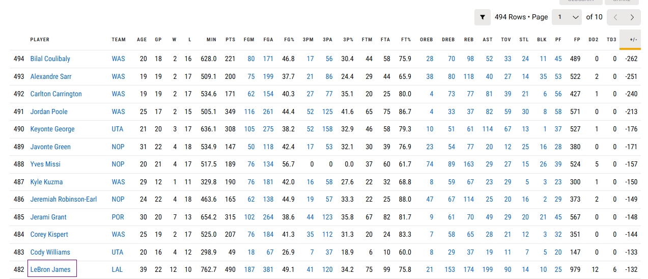 本賽季至今,詹姆斯的累計正負(fù)值為-132(在湖人隊內(nèi)墊底),在聯(lián)盟排名倒數(shù)第13位(正數(shù)第482位)。
