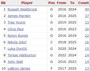 據(jù)統(tǒng)計,這是威少過去10個賽季以來,第50次半場助攻上雙,為同期最多,哈登以37次排第二。