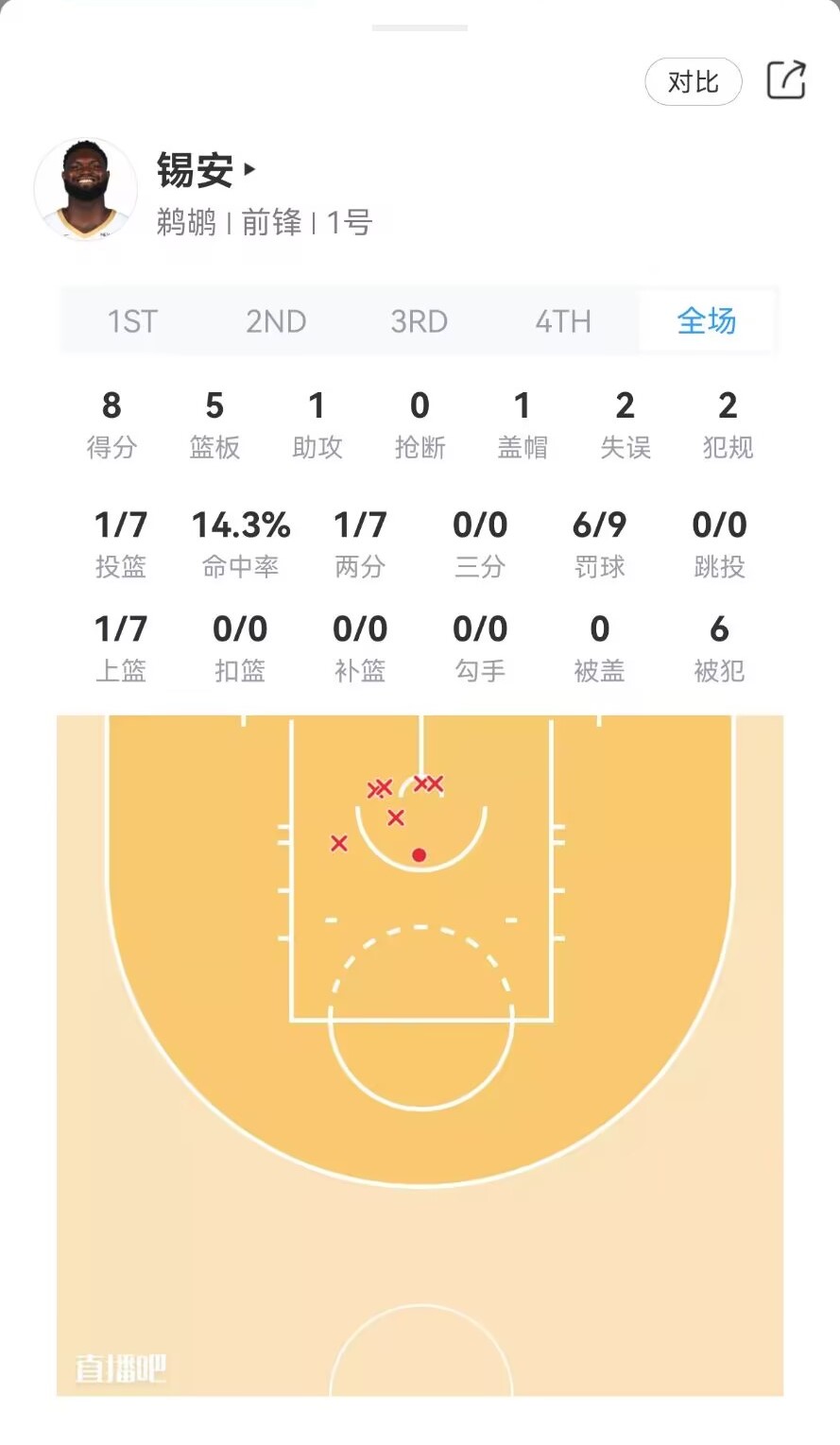 半場比賽結(jié)束,鵜鶘手感冰涼,其中球員錫安7投1中,CJ-麥科勒姆10投0中,阿爾瓦拉多7投0中,霍金斯6投0中。四人半場合計(jì)30中1,球隊(duì)半場落后31分。