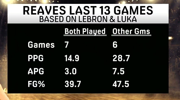 東詹一起出戰(zhàn) 搭檔里夫斯共7場比賽 后者場均14.9分3助 命中率39.7%