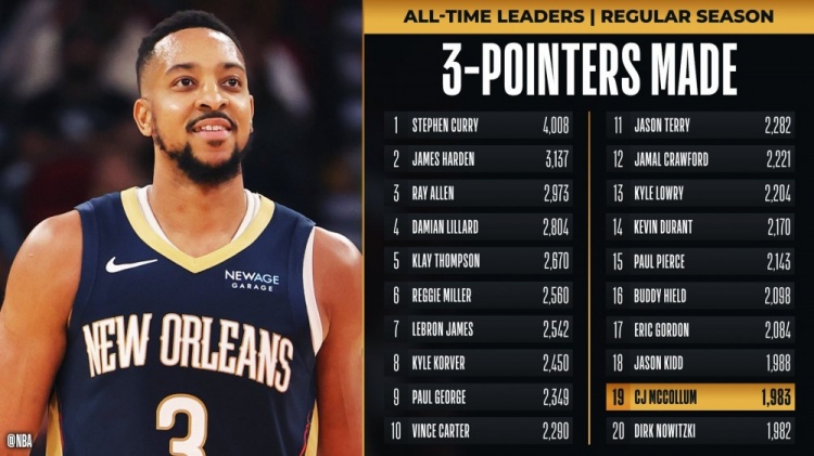 截至發(fā)稿,CJ命中3記三分,生涯三分命中數(shù)1983,超越諾維茨基升至NBA歷史第19位。