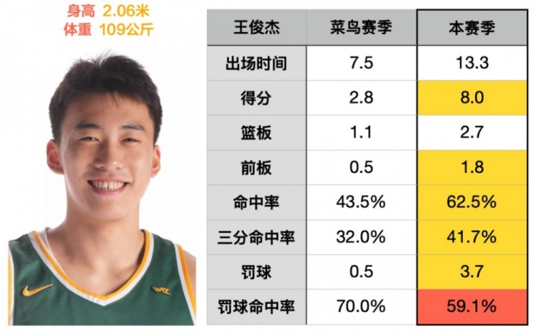 今年是王俊杰為舊金山大學(xué)(以下簡稱USF)打球的第二個賽季,他的數(shù)據(jù)產(chǎn)量也比去年有了一定程度的漲幅,而漲幅的部分主要集中于四個方面——