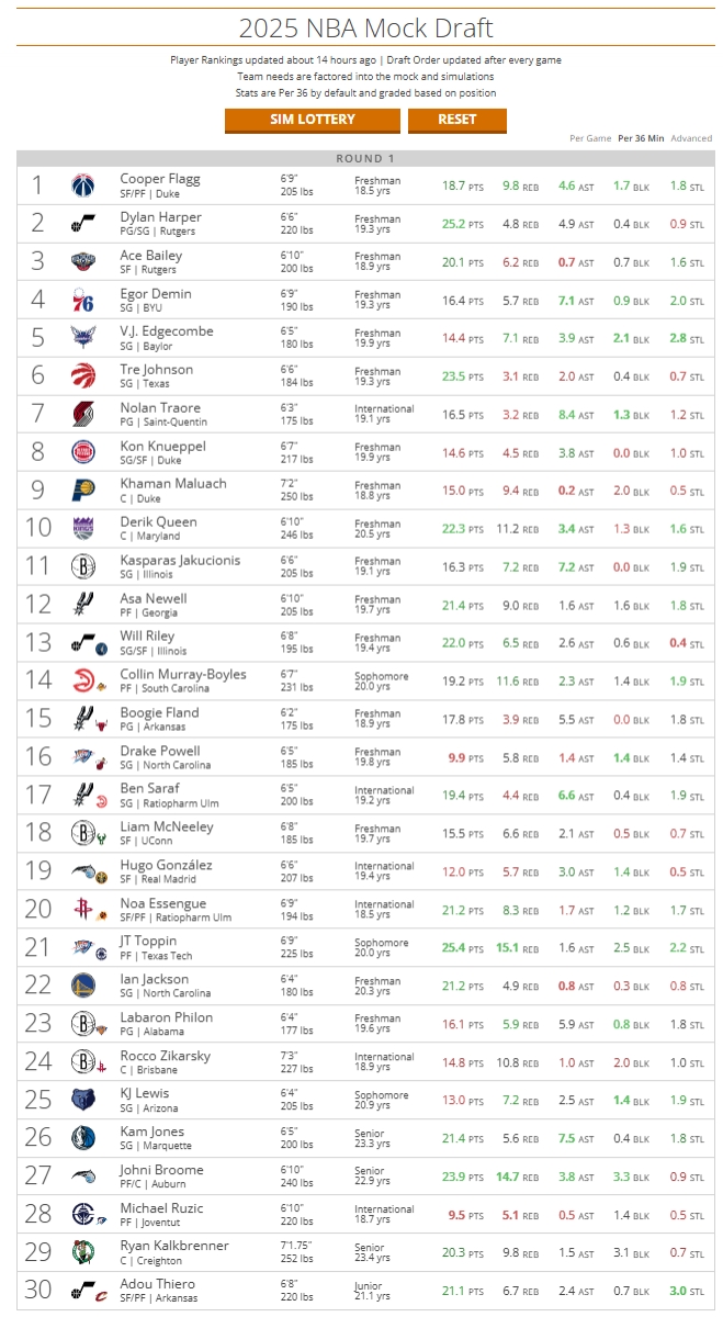 12月06日訊 知名模擬選秀網(wǎng)站Tankathon更新25年NBA模擬選秀排名,其中庫(kù)珀-弗拉格依舊穩(wěn)居狀元,榜眼則是羅恩-哈珀的二兒子迪倫-哈珀,埃斯-貝利位列探花。此前排在56順位的楊瀚森已不在榜單。