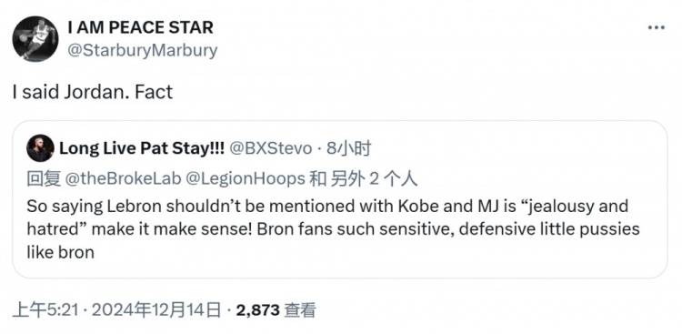 網(wǎng)友2:“認(rèn)為把勒布朗和科比、喬丹相提并論的說法出于‘嫉妒和仇恨’,這就說得通了。勒布朗的球迷是如此敏感、防御心強(qiáng),就像勒布朗一樣是軟弱的人。