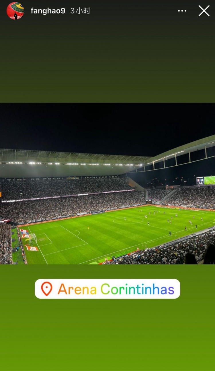 12月4日訊 今天,方昊更新社媒動態(tài),人在巴西的他現(xiàn)身巴甲豪門科林蒂安的主場。