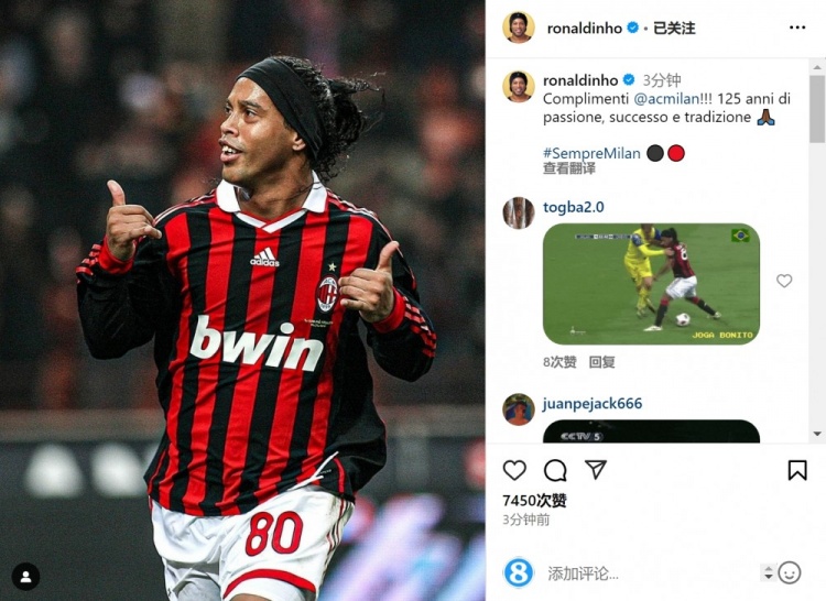 羅納爾迪尼奧在社交媒體上曬出自己效力米蘭時期的照片,配文:“祝賀AC米蘭,125年的激情、成功和傳統(tǒng)。”