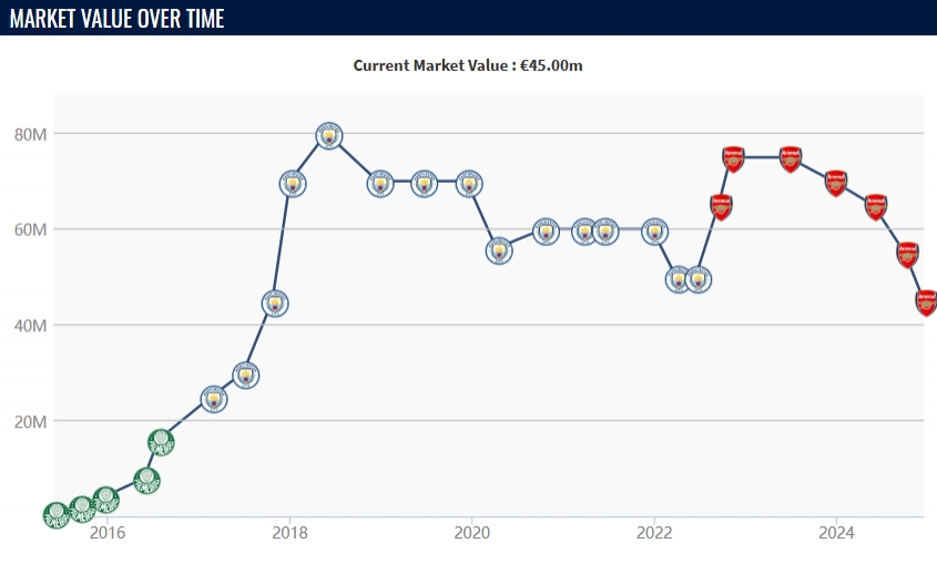 12月17日訊 昨日德轉(zhuǎn)更新英超球員身價,阿森納前鋒熱蘇斯身價遭遇四連跌,由2023年6月的7500萬歐元下降了3000萬歐,目前身價為4500萬歐元。