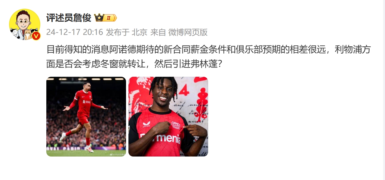 詹俊在社媒寫道:目前得知的消息阿諾德期待的新合同薪金條件和俱樂部預(yù)期的相差很遠(yuǎn),利物浦方面是否會(huì)考慮冬窗就轉(zhuǎn)讓,然后引進(jìn)弗林蓬? ???