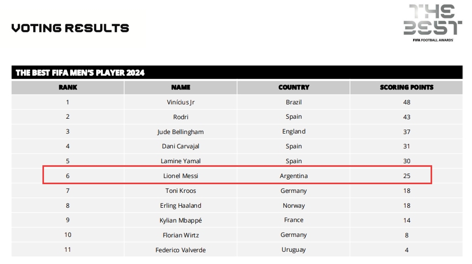 12月18日訊 2024年FIFA年度最佳頒獎,維尼修斯48分獲獎,梅西25分第六,以下是梅西得票詳情。
