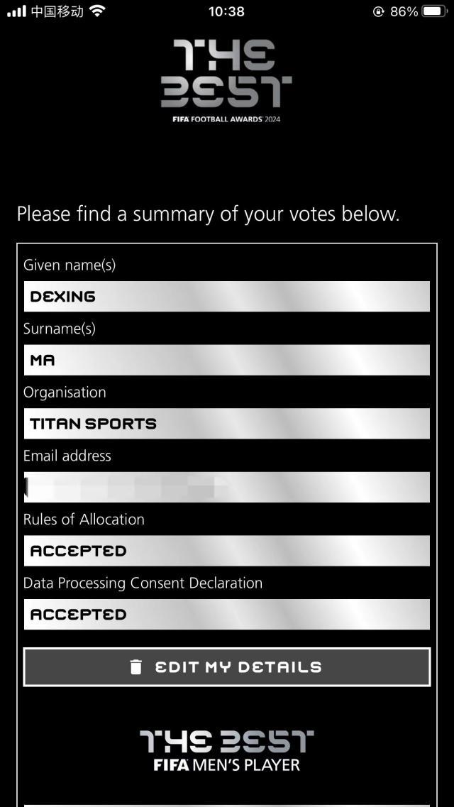 12月18日訊 2024FIFA最佳頒獎今日揭曉,維尼修斯當選最佳男足球員。中國區(qū)評審馬德興的投票與前三吻合,他發(fā)文介紹了本次投票的理由。