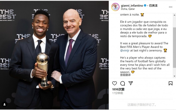 因凡蒂諾曬出與維尼修斯在領獎現(xiàn)場的合照,并配文:“很榮幸在昨晚的頒獎典禮上向維尼修斯頒發(fā)國際足聯(lián)最佳男足球員獎項?!?/p>