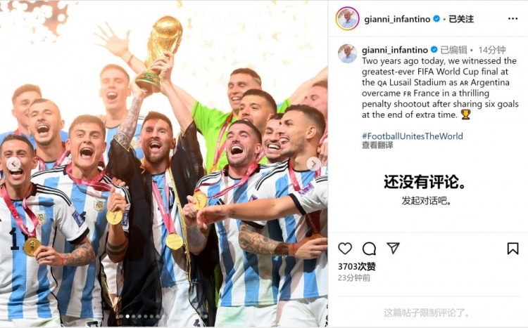 國(guó)際足聯(lián)主席因凡蒂諾在社交媒體上曬出梅西捧杯的照片,并寫道:“兩年前的今天,我們?cè)诒R塞爾體育場(chǎng)見(jiàn)證了有史以來(lái)最偉大的世界杯決賽?!?/p>