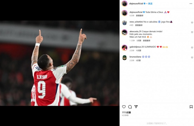 這也是他加盟槍手后首次上演帽子戲法,熱蘇斯也在賽后通過社媒曬出自己雙手指天慶祝勝利的慶祝照,并配文:“所有榮耀都歸于上帝”。
