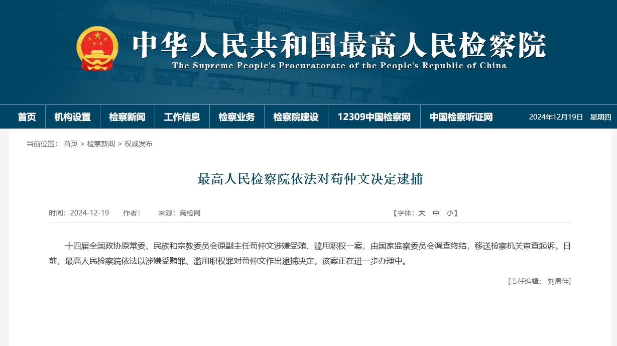 2024年12月19日,最高檢依法對原國家體育總局局長茍仲文決定逮捕