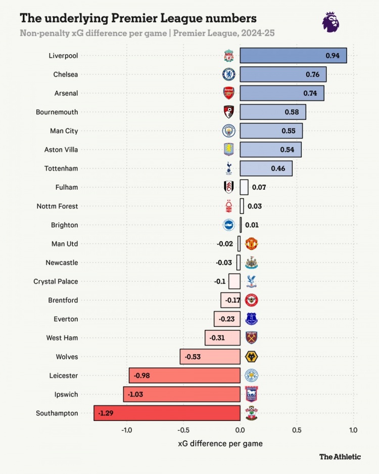 本賽季英超各球隊預(yù)期進(jìn)球差值榜單