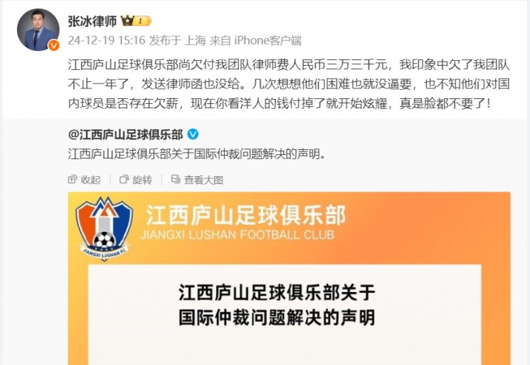 張冰在個人微博中寫道:江西廬山足球俱樂部尚欠付我團隊律師費人民幣三萬三千元,我印象中欠了我團隊不止一年了,發(fā)送律師函也沒給。幾次想想他們困難也就沒逼要,也不知他們對國內(nèi)球員是否存在欠薪,現(xiàn)在你看洋人的錢付掉了就開始炫耀,真是臉都不要了!