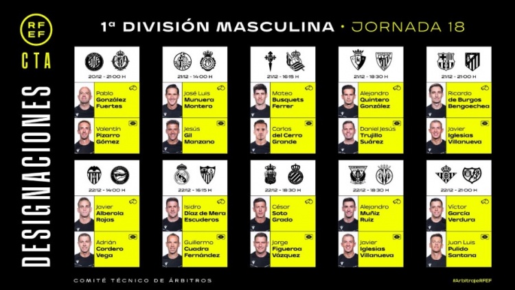 12月19日訊 本周末,西甲第18輪將全面開戰(zhàn),西班牙足協(xié)官方公布了本輪比賽的裁判安排。執(zhí)法巴薩主場(chǎng)迎戰(zhàn)馬競(jìng)焦點(diǎn)戰(zhàn)的是本戈切亞,埃斯庫(kù)德羅斯主裁皇馬對(duì)陣塞維利亞。