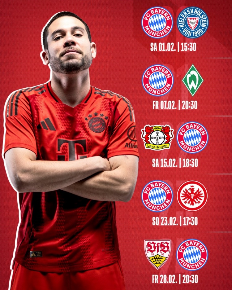12月19日訊 德甲第20輪到第24輪比賽時(shí)間出爐,拜仁曬出了球隊(duì)的賽程,2月16日1點(diǎn)30分客場(chǎng)對(duì)陣?yán)瘴謳?kù)森,2月24日0點(diǎn)30分主場(chǎng)對(duì)陣法蘭克福。