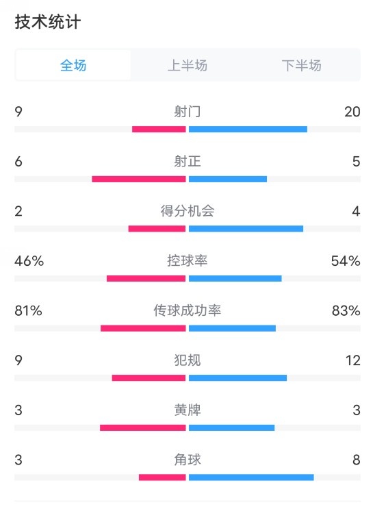 全場(chǎng)比賽數(shù)據(jù)如下(曼聯(lián)在后):