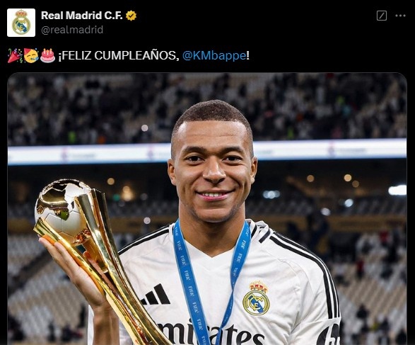 皇馬官方曬出了一張姆巴佩捧著洲際杯冠軍獎杯的照片,并送上了生日快樂的祝福。