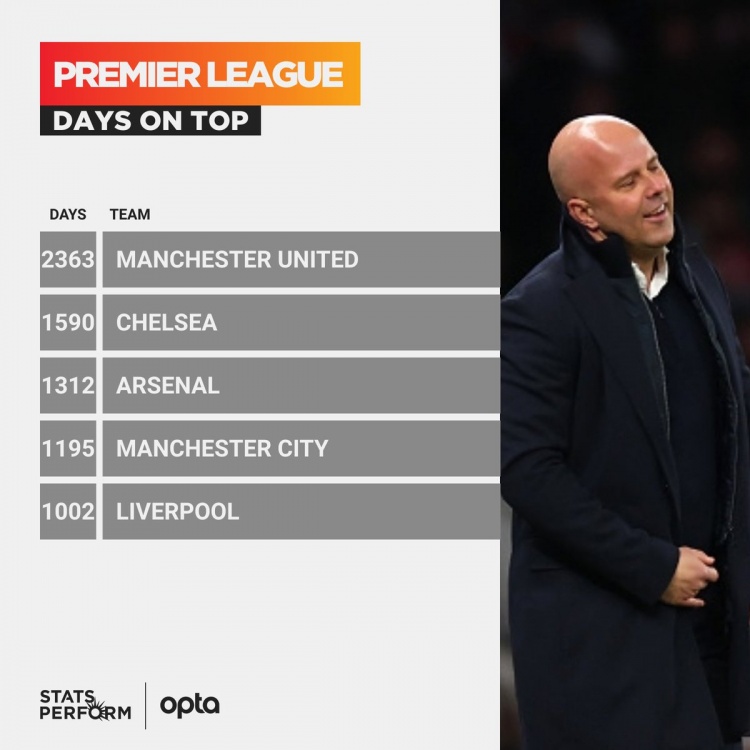 12月23日訊 Opta統(tǒng)計了各隊處于英超榜首的天數(shù),并列出榜單,目前的英超榜首球隊利物浦以1002天排名第五位。