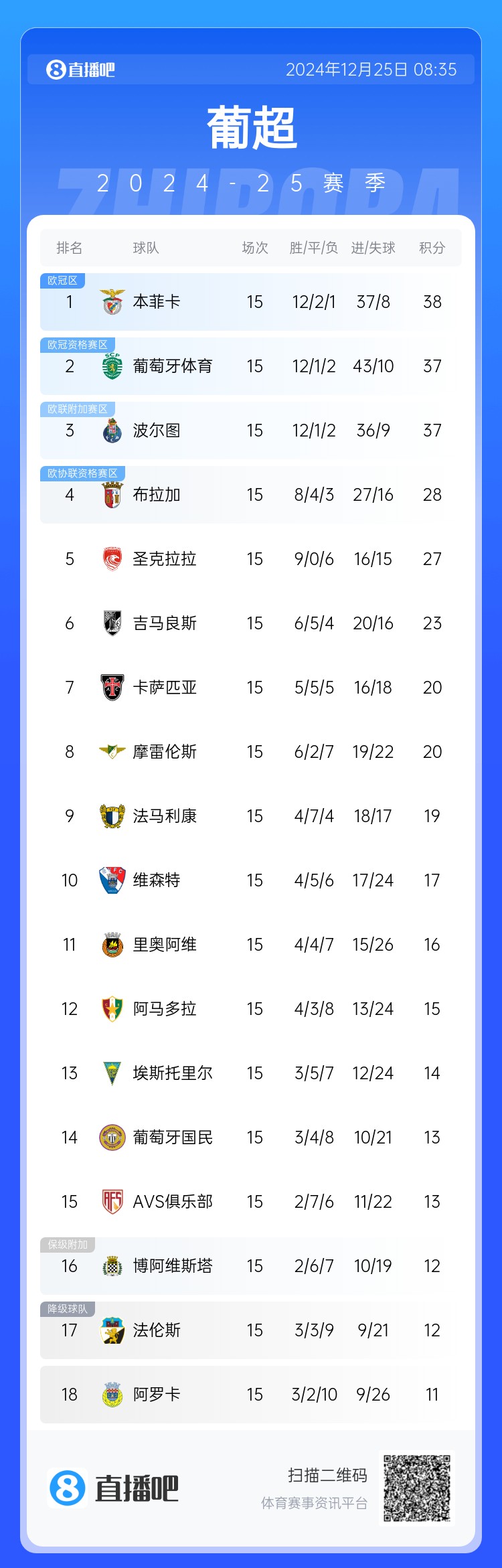 12月25日訊 第15輪葡超結(jié)束,葡萄牙體育0-0戰(zhàn)平維森特,近4輪僅1勝丟掉榜首。
