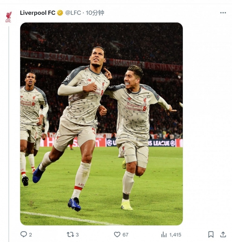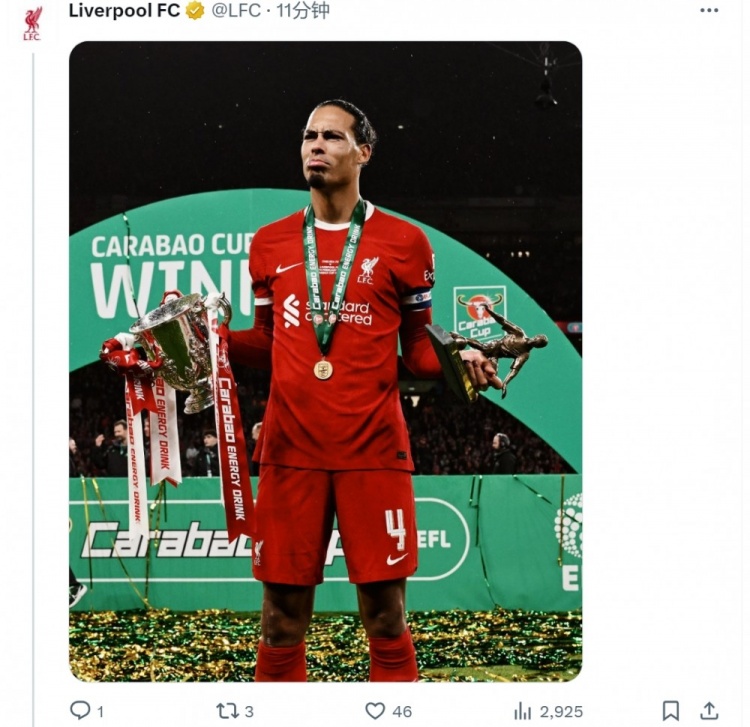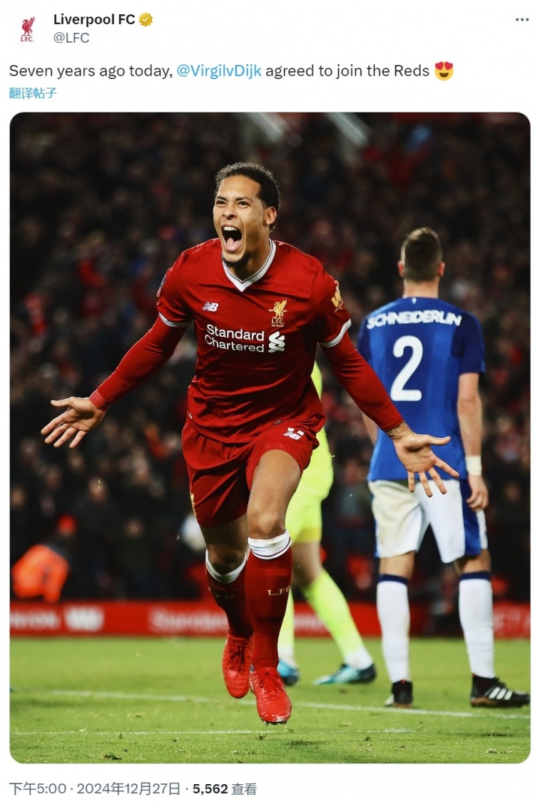 2017年12月27日,利物浦宣布簽下南安普頓中衛(wèi)范迪克,球員1月正式加盟,轉(zhuǎn)會(huì)費(fèi)8465萬(wàn)歐元(德轉(zhuǎn)信息)。利物浦官方更新社媒動(dòng)態(tài),曬出范迪克效力球隊(duì)以來(lái)的多張照片。