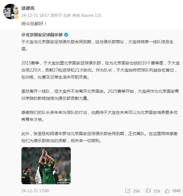 1月1日訊 在2024年的最后一天,北京國(guó)安宣布于大寶退役并成為青訓(xùn)學(xué)院教練。相聲演員徐德亮通過微博轉(zhuǎn)發(fā)于大寶退役的消息,同時(shí)送上“祝今后都好”的祝愿。