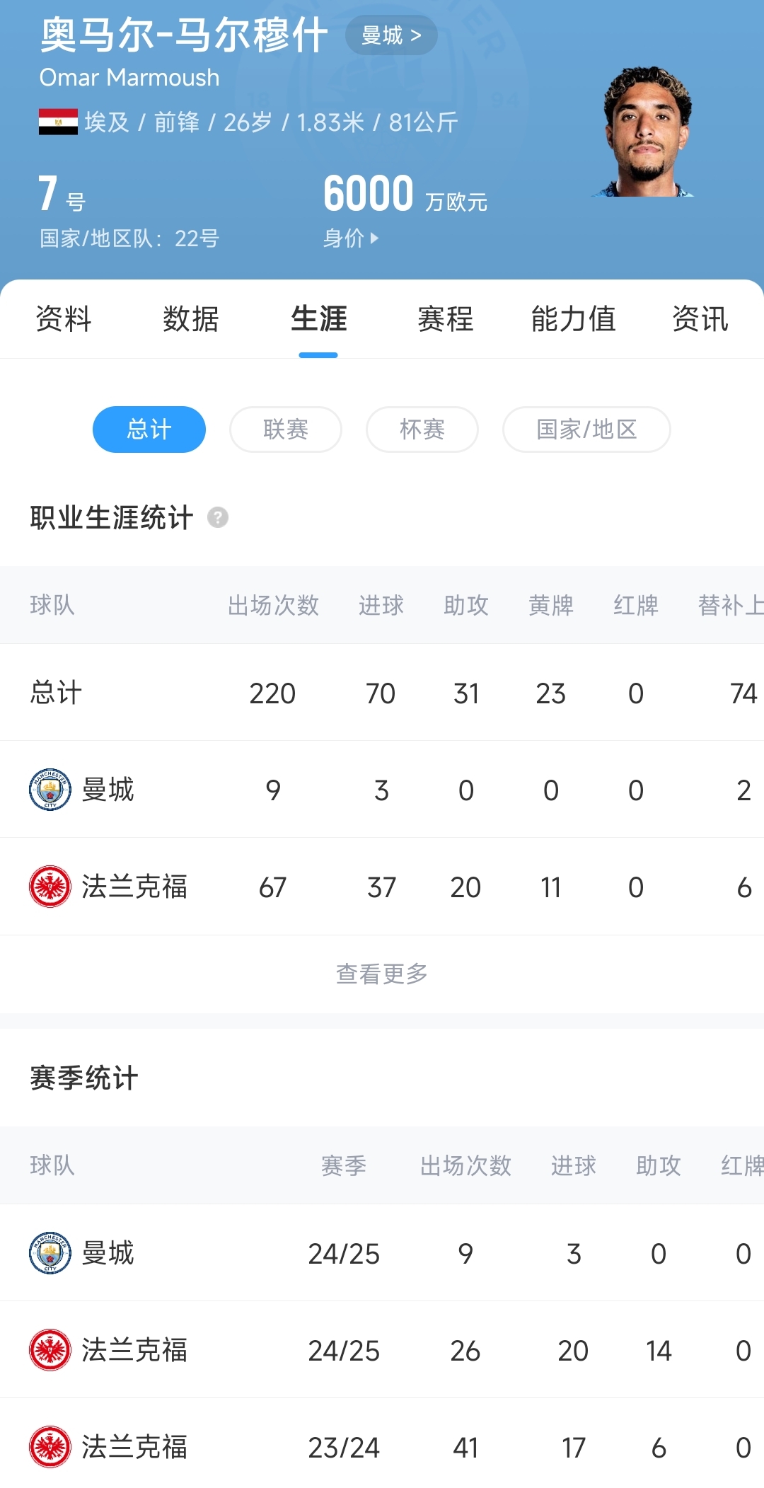 而在加盟曼城前,馬爾穆什本賽季在法蘭克福的數(shù)據(jù)為26場20球14助。目前26歲的馬爾穆什德轉(zhuǎn)身價為6000萬歐元,他與曼城的合同將在2029年6月到期。