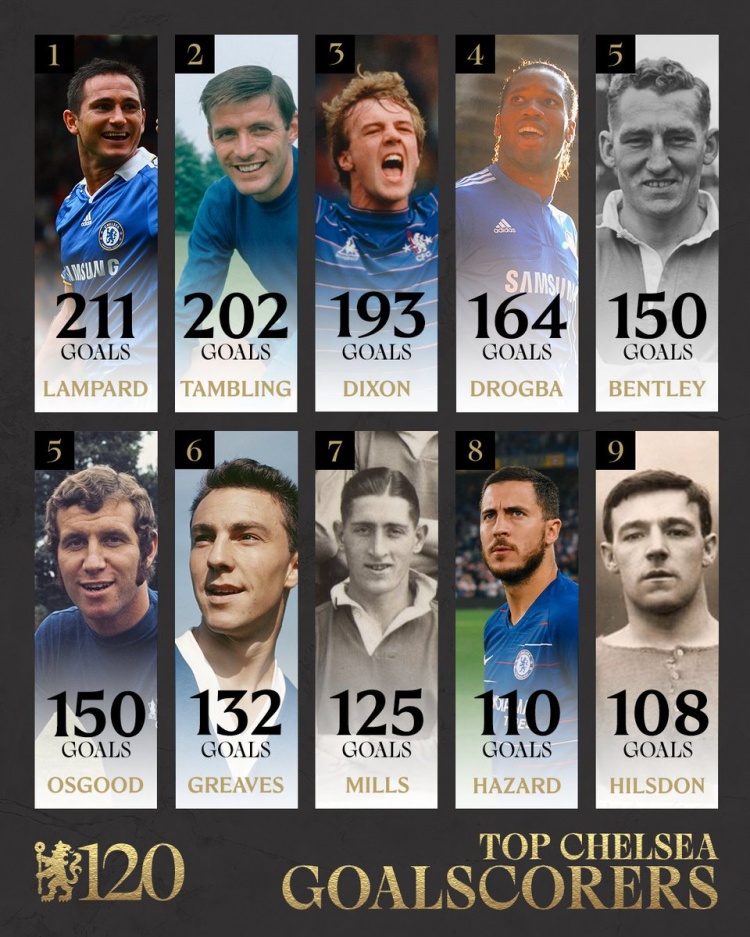 3月11日訊 切爾西俱樂部成立120周年,俱樂部官方社媒曬出了截至目前隊(duì)史射手榜,蘭帕德211球居首。