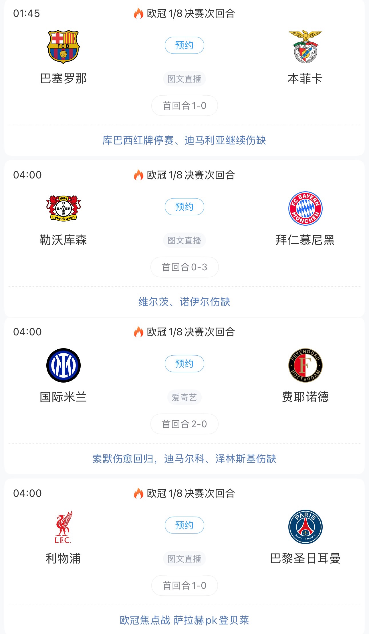 北京時(shí)間明天凌晨,歐冠1/8決賽次回合開(kāi)打,利物浦大戰(zhàn)巴黎,薩拉赫與登貝萊繼續(xù)“金球之爭(zhēng)”,拜仁與勒沃庫(kù)森上演德甲內(nèi)戰(zhàn),巴薩、國(guó)米出戰(zhàn)。四組對(duì)陣中會(huì)不會(huì)出現(xiàn)逆轉(zhuǎn)?今晚拭目以待!