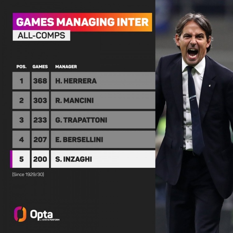 數(shù)據(jù)統(tǒng)計顯示,他也是1929-30賽季有統(tǒng)計以來第5位達成此成就的國米主帥。