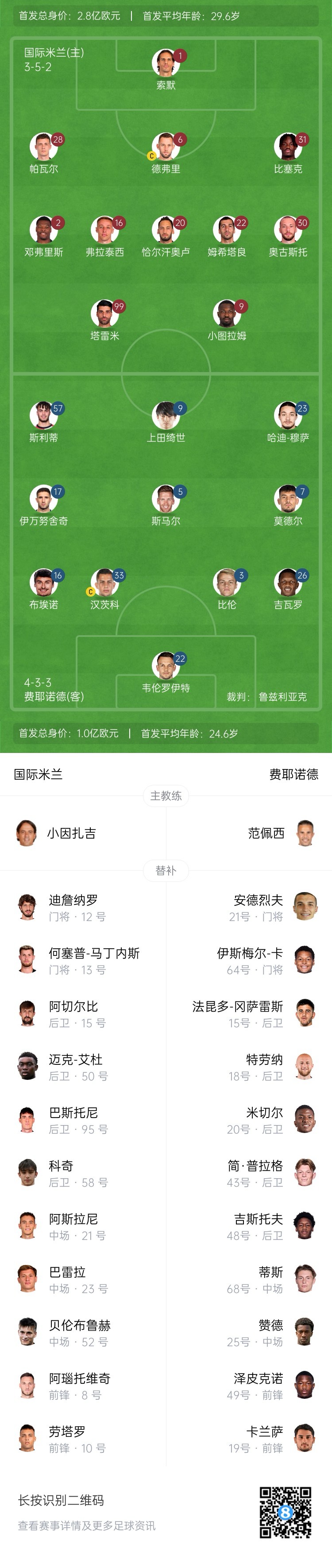 國米原定首發(fā)為德弗里,開場前10分鐘消息,德弗里熱身出現(xiàn)傷情,阿切爾比進(jìn)入首發(fā)。
