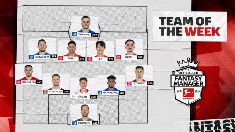 3月12日訊 德甲第25輪聯(lián)賽已經(jīng)完賽,德甲官方也評出了本輪聯(lián)賽最佳陣容,美因茨和霍芬海姆各3將在列。