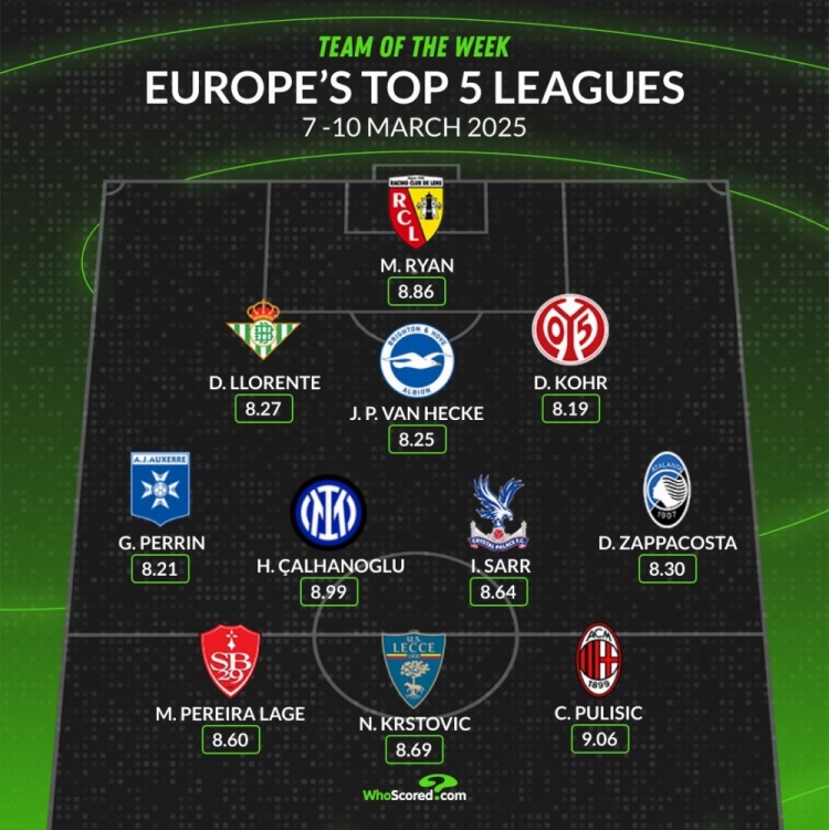 3月12日訊 本周五大聯(lián)賽已經(jīng)全部完賽,whoscored也統(tǒng)計(jì)了本周五大聯(lián)賽最佳陣容,意甲4將在列。